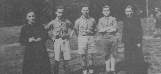 Deze archieffoto dateert uit 1947 toen de Jonge Klauwaarts uit Hasselt op kamp waren te Zutendaal. Men herkent als kampleiders v.l.n.r. priester Douwe, Thuur De Mayer, Toon Reckers, Raymond Smeets en priester Moesen. |