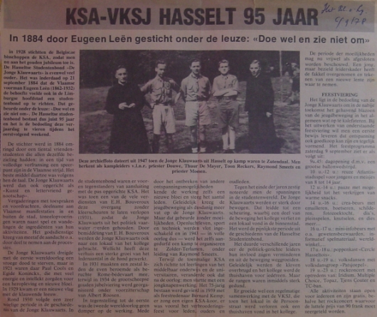 was toen een van de vele verdiensten van E.H. Bouveroux In 1931 maakten een zestal leden de even beroemde als beruchte Rome-bédevaart mee, terwijl in 1934 de grootscheepse gouden jubel viering werd georganiseerd onder voorzitterschap van Albert Roosen. In tegenstelling tot de eerste was de tweede wereldoorlog geen domper op de werking. Mede door het ontbreken van andere ontspanningsmogelijkheden kende de werking zelfs een nieuwe bloei en steeg het aantal leden. Geleidelijk kreeg de jeugdbeweging als dusdanig meer vat op de Jonge Klauwaarts. Maar dat gebeurde zonder moeilijkheden. Openluchtleven, sport en techniek werden vlot ingeschakeld en in 1943 — in volle oorlog dus — werd het zelfs aangedurfd een kamp te organiseren te Zolder-Terlamen, onder leiding van Raymond Smeets. Terwijl de toenmalige KSA zich richtte tot leerlingen van het middelbaar onderwijs en de universitairen, veranderde ook dat na de oorlog: men startte met een jongknapenwerking. Het 75-jarig bestaan werd gevierd in 1959 met als feestredenaar Bernard Kemp; er zong een eigen KSA-koor, er was vooral het verbroederingsfeest voor leden, ouders en oudleden. Tegen het einde der jaren zestig noteerde men de spanningen in de studentenwereld. De Jonge Klauwaarts werden er sterk door bewogen. Dat leidde tot een scheuring, waarbij een deel van de beweging het kollege verliet en een lokaal vond in de binnenstad. Het werd de pijnlijkste periode uit de geschiedenis van de Hasseltse Studentenbond. Het duurde verschillende jaren eer de politiek-gerichte leiders hun invloed zagen verminderen en uit de beweging weggroeiden. Geleidelijk werden de kloven overbrugd en het kollege werd de thuishaven voor iedereen. Maar de rangen waren inmiddels sterk gedund. Er groeide wel een regelmatige samenwerking met de VKSJ, die toen het lokaal in de Persoonstraat werd verloren ook een thuishaven vond in het kollege. De periode der moeilijkheden mag nu vrijwel als afgesloten worden beschouwd. Een jong, maar bezield leiderskader heeft de fakkel overgenomen en tekenen van een nieuwe lente zijn waar te nemen. FEESTVIERING Het ligt in de bedoeling van de Jonge Klauwaarts om in de nabije toekomst het gehavend blazoen van de jeugdbeweging in het algemeen wat op te kalefateren. Bij het uitwerken van onderstaande feestviering wil men een eerste bewijs leveren dat ontspanning ook goedkoop kan zijn en tegelijk vormend. Het feestprogramma zaterdag 9 september ziet er als volgt uit: 9u.45: dagopening d.m.v. een grootse ballon