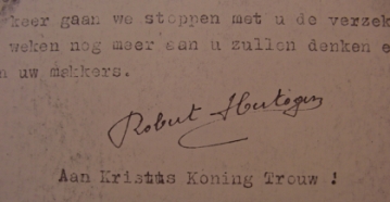En nu willen we ons praatje verder zetten, uitgepraat geraken we toch nooit, hé want we zouden u nog zoveel willen vertellen. Op 31 Oktober j.l. vierden we het feest van onze Grote Koning-Kristus. Op die dag zijn we weer eens te meer met u verenigd geweest. Solidair in die trouw aan Hem die gans ons ideaal van de God-Werkman in zich verpersoonlijkt. Zijn leven was een "totaal" geven van zich zelf, tot vrijmakiung van heel het mensdom, dus ook van ons, van alle makkers, jonge arbeiders. Wat een aanmoedigend voorbeeld is dit toch voor ons! Is er wel een schoner ideaal in een mensenleven dan het wegschenken van zich zelve! En wij willen dat doen, beginnende met het "kleine" in ons leven. Het is toch opvallend dat uw brieven daarvan altijd het eerst spreken: een dienst bewezen, 'n handje toegestoken, 'n glimlach en een aanmoedigend woordje geschonken aan een ontmoedigde, een "gelukzoeker" den weg gewezen en geholpen op de weg naar het ware geluk, terug naar God, naar Hem die altijd vertroosting brengt, en ... zo gaat het altijd voort in uw brieven. Edele zielen, edele daden! Wij zijn de novembermaand ingetreden en we tellen weer één zomer minder in ons leven. De Herfst jaagt het leven uit de natuur, nog een laatste zonnetje speelt in de kleurenpracht der goudgele bladeren. De lange avonden dreigen de somberheid van het dagelijkse leven van arbeid en zorgen nog te vergroten. Meer nog dan in het verleden, denkt ge, en voorzeker is dat ook zo bij uw makkers, aan hen die ge verlaten hebt: uw familie, vrienden, Kajotters en anderen, misschien uw verloofde. Dat is goed, m'n vriend, maar wij, Katholieke jonge arbeiders, gaan nog verder en denken in de Novembermaand heel speciaal aan hen die ons op deze aarde voor eeuwig verlaten hebben: onze dierbare overledenen. Zonder hen te vergeten die in alle landen van de wereld gevallen zijn op het slagveld, zonder onderscheid van taal of land. "Het is een heilig en zalig gedacht te bidden voor onze overledenen" zegt onze moeder de H./Kerk. Tracht in de komende dagen die gedachte op te wekken bij uw makkers. Zo zal de strijdende Kerk denken aan de Kerk die lijdt! Wat vliegt de tijd toch snel! Hoe rap zullen we alweer staan voor de maand December en zo we Kerstmis hier in het vaderlad nog niet samen kunnen vieren, dan toch zullen we het doen in een zelfde gemeenschap van gedachten, wij hier en gij ginder. De Adventstijd is voor ons de voorbereiding, de wachttijd tot het grootse gebeuren van de komst van de Verlosser op deze aarde. Sommigen onder u zullen zeker proberen om een Adventskrans in hun kamer of barak te hangen! Kaarsen kan men desnoods vervangen door lampjes. En zo groeit reeds de "stemming" in voorbereiding van het Kerstfeest, dat een kristelijk feest wordt in uw kamer en lager, daar zult ge met uw makkers voor zorgen. Een Kerstfeest zoals we dat vieren in al de parochie's van ons dierbaar Vlaanderen. W i j d e n k e n a a n u ... Reeds is men in de weer in de praochie's om u allen een verrassing te bezorgen. Hebben uw makkers iets speciaal te vragen, dat ze dan maar op tijd schrijven. Allen zouden toch ook moeten 'n briefje schrijven naar hun familie en naar hun parochie, en als ge ze ertoe kunt aanzetten om bijzonder te sparen tegen die tijd en 'n flink sommetje op te zenden, dan moet ge het ook niet laten, hoor! Het zal dan hier in de familie ook een aangename verrassing zijn! Wat we aan u zenden dat willen we nog niet verklappen, weet je, toch wel i e t s : een Kerststalleke met het nodige materiaal, liederen, novelle, versiering, speciaal vuur u gemaakt, om het u mogelijk te maken een klein feestje in te richten. Schrijf ook maar eens naar uw parochie, want vele handen zullen er nodig zijn om hierin 'n beetje te helpen. En boven het stalleke: een sterre, hoop in de toekomst, wegwijzer voor zovelen, met engelen die "de V r e d e op aarde aan alle mensen van goed wil" zullen brengen. Als het mogelijk is gaat ge naar de Kerstmis, of toch tenminste een andere mis gedurende de Kerstdagen, waarin een schare van jonge mannen zich zal voeden aan het goddelijke Lichaam van de Heiland. Natuurlijk gaat ge op tijd beginnen en zult ge uw makkers begeesteren om samen een heerlijke Kersttijd voor te bereiden. Wij denken aan U, nu reeds, en op Kerstmis, nog inniger verbonden met U. Denkt ook gij aan ons! Allen moeten er in betrokken worden, opdat het iets wordt van heel uw "gemeenschap". In de vele kloosters van ons land wordt er voortdurend aan u gedacht. Een ononderbroken ketting van gebeden, missen en offers legt een geestelijke band tussen u en hen. We zenden u enige boeken ook, die uw boekenschat weer wat deden aangroeien en u enu w makkers weer enige aangename en leerzame uren zullen verschaffen. Waarschijnlijk zult ge de gebedenboekjes ook reeds ontvangen hebben. Daarmee is het mogelijk de H.Mis beter bij te wonen, ja zelfs als dit nu en dan al eens niet kan, in uw kamer er gezamenlijk uit lezen. Zo er makkers zijn die voor het kerkboekje een klein e vergoeding willen betalen, zal u dit goed van pas komen voor de bekostiging van het Kerstfeestje. Beste Vriend, voor deze keer gaan we stoppen met u de verzekering te geven dat we in de komende weken nog meer aan u zullen denken en het beste te wensen aan u en uw makkers. |