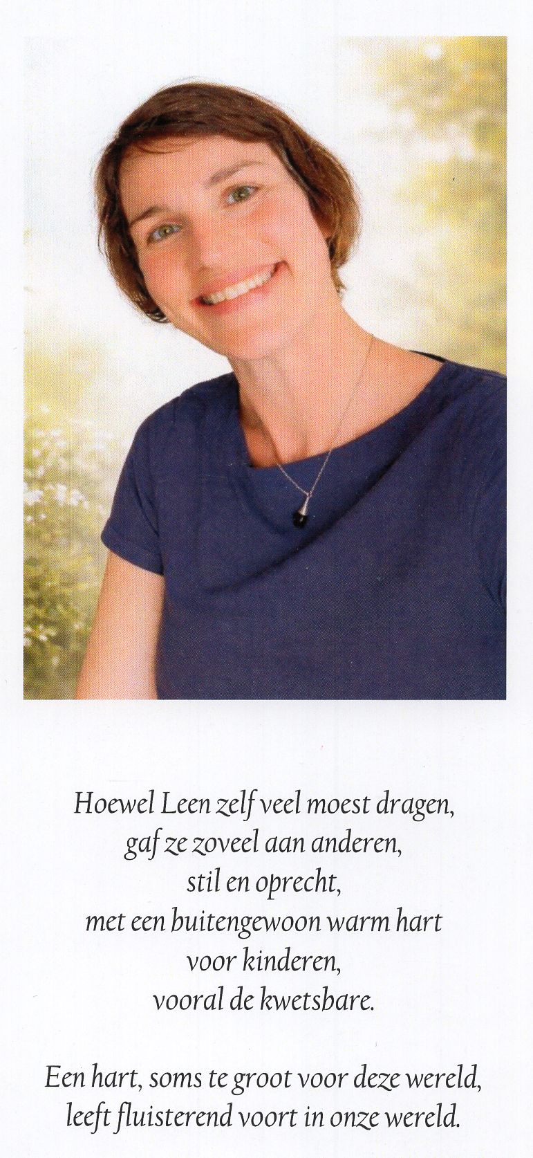 afscheid door: Jan Hertogen, vader (gelezen door Lisette Vanhees, meter van Leen) An Buelens, vriendin Joke Hertogen, zus DIWI (gevraagd) Fjore, metekind van Leen |